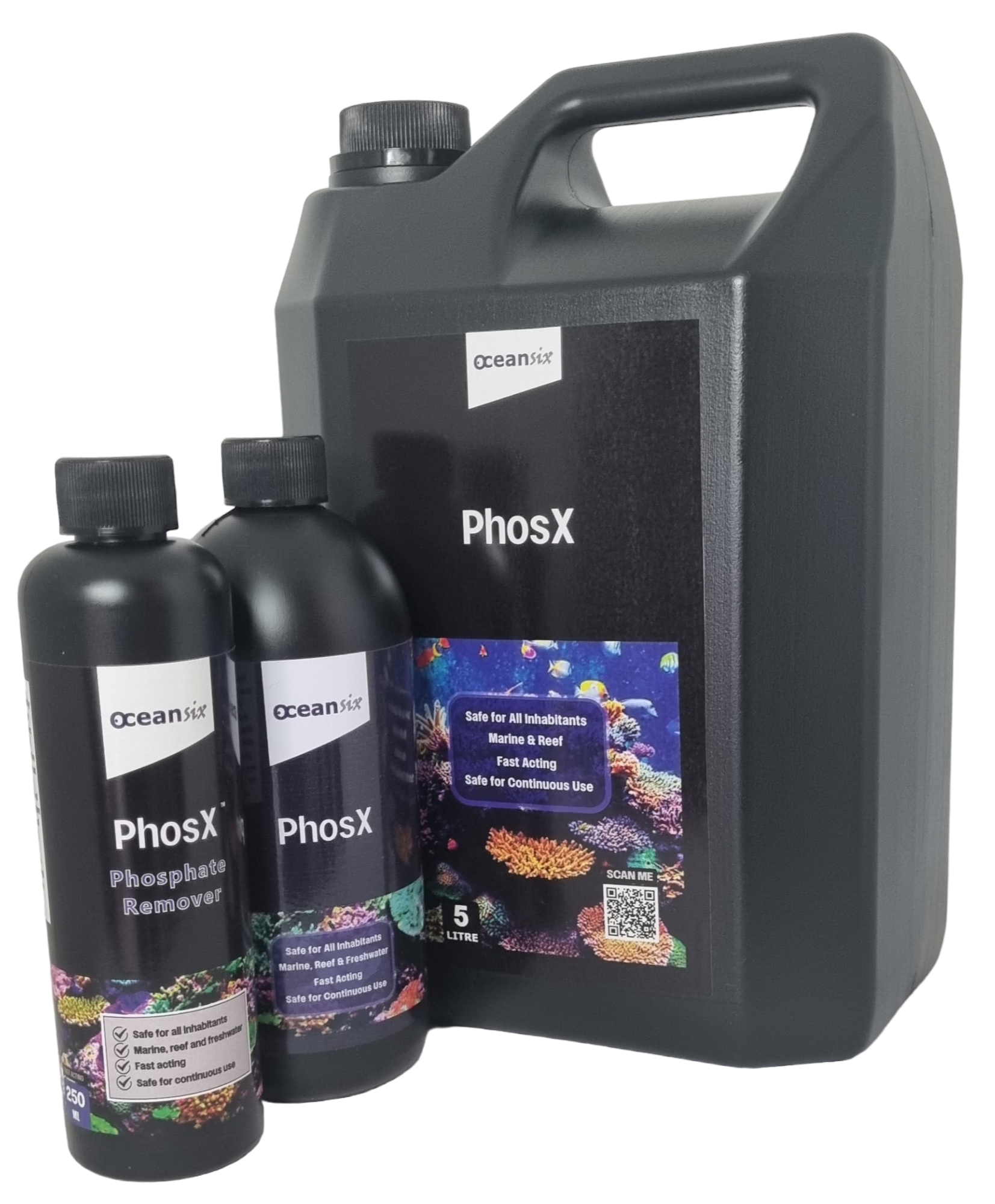 OceanSix PhosX rapidly decreases phosphate levels in aquarium water. PhosX starts to work immediately and turns the phosphate into a form that can be removed by mechanical filtration. 5ml of PhosX will remove 0.01ppm phosphate from 100L of aquarium water.